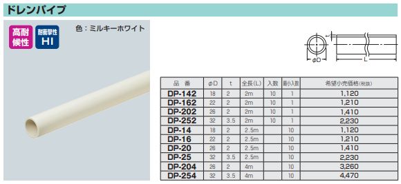 【未来工業/MIRAI】 DP-202 ドレンパイプ 外径26φ 長さ2m